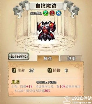 血纹魔铠:满级提供5%的防御和生命加成和30%几率被近战攻击减伤30%。