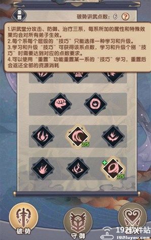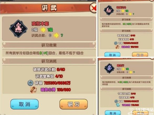 3、讲武堂,很多人在讨论建不建这个建筑,我建议是一定要建的。因为讲武的属性是对全弟子都有加成的。讲武分为3部分(破势、御守、回天),可以简单的理解为点3个技能树。讲武越到后期加成越多,终极技能更是BUG级的存在。