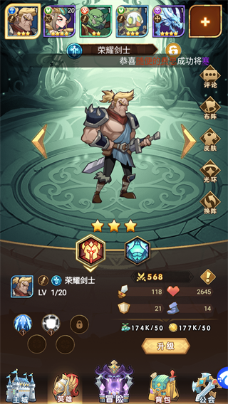 荣耀崛起官方版是一款地牢设定的放置卡牌游戏,这里要招募勇士来一起探索地图,战斗核心是组队,放置类设定也不需要操作,游戏中将角色划分为五个星级,一般三星就能用,有些特殊三星角色还有不可替代的作用,数值上比较平衡,而且抽奖也比较简单,虽然高级招募劵很难获得,但是普通招募、友情招募都能获得五星英雄,而且招募劵容易获得哦。