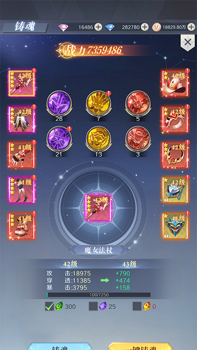 装备页面提供一键铸魂功能,自动消耗相应铸魂石进行升级。