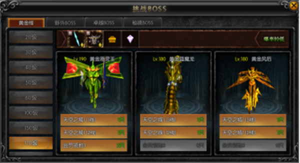在【挑战BOSS】界面,可见到四大BOSS分区,包括黄金怪、野外BOSS、卓越BOSS及秘境BOSS,旨在便捷玩家查看与寻找BOSS,避免不必要的搜索困扰。
