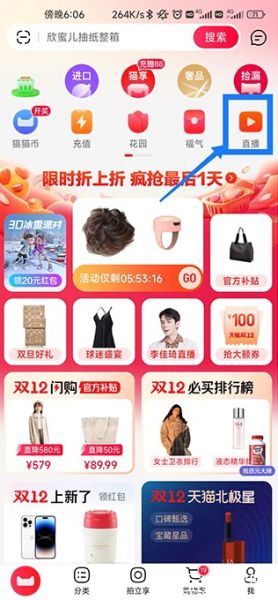 天猫官方旗舰店app怎么看直播?