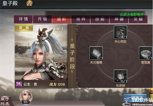 3.2.2、皇子进阶:通过激活当前阶段的皇子宝物,即可将皇子成长到下一个阶段。获得基础属性与资质属性的提升;