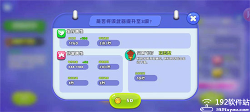 3、玩家可以点击想要升级的武器,看武器的基本属性,列如:每秒伤害、移速、射程。武器除了最基本的伤害不同,每一个武器还带着额外的伤害技能,而且武器不同玩家的生命值也会不同。每升级一次,以上的这些属性都会发生改变,所以武器升级还是非常重要的。