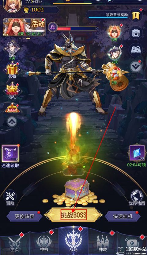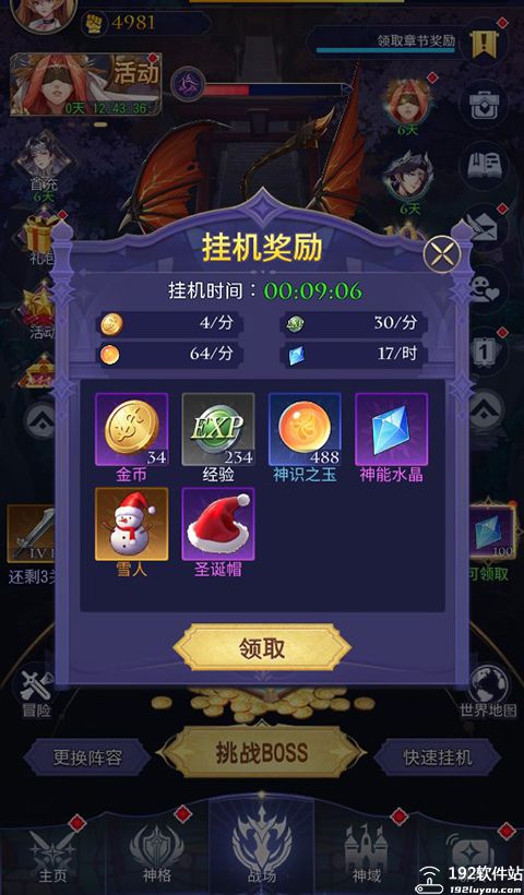 玩家在boss挑战的过程中还会积累挂机奖励,点击中间的宝箱就可以领取挂机奖励。