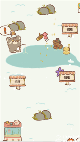 鱼塘布置:渔夫兔丁、6个摊位、鱼塘贩卖机、鱼塘。