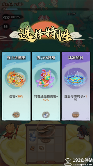 迷你勇士手游以经典的西游题材作为背景,想必大家一定再熟悉不过了,作为咱们从小看到大的经典作品,设计团队为了给大家制造一些新鲜感,首先从场景的构造和人物的设计上采用了二次元的画风,让大家的修行之旅不再枯燥乏味,而是能够发现更多的乐趣所在。也不是单纯的通关杀怪,玩家需要面对一波波来势汹汹的妖怪,每当抵挡一波进攻后,有机会提升等级,可以获得选择技能的机会,从三个技能当中选择一个最适合的,比如强力金箍圈,可以直接增加30%伤害,强力化妖葫,对普通怪物伤害加40%,冰冻加时可以让莲台冰冻时长加1秒。