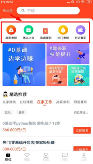 2、我们会为你精选推荐一些合适岗位,大家也可以在上方各大板块选择,比如高薪兼职、优先上岗等。