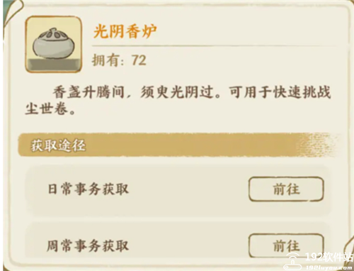 文物的主要获取方式在时之隙的文物探寻里消耗窥宝镜抽取,当我们抽取到重复的文物时即可前往藏珍阁找到对应文物进行升星。目前主要的文物的养成材料在尘世卷玩法中获取,玩家通过对应关卡可以获得不同文物的升级材料以及窥宝镜。四类文物对应需要四种不同的升级材料,当我们急需某一种材料的时候,可以使用光阴香炉多次快速挑战对应关卡。