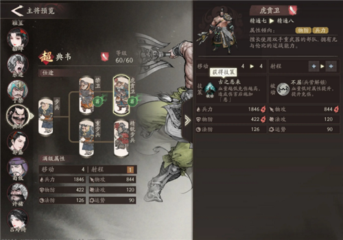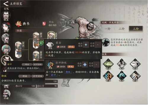 资源足够的话,在前期可以把重步兵线也点开,折冲御敌这个技能在前期主将不全时功能性还是比较好的。前期推荐折冲御敌和重击。在后期没有辅助位或生存压力大时推荐阻敌,古之恶来,背水一战。而在生存压力小或者有护盾类辅助帮忙控血时推荐古之恶来,阻敌和重击。