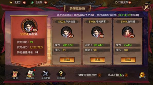 与上榜玩家进行对决,胜利名次上升,每局战斗采取三局两胜制无论输赢都会有奖励。