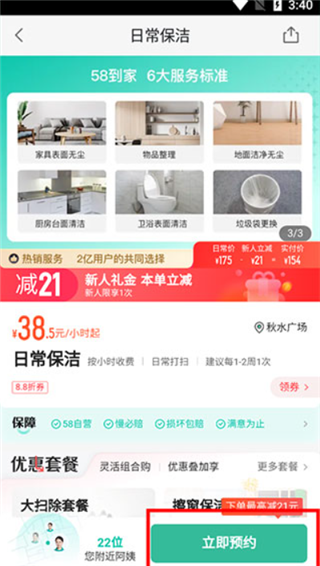 58到家app官方版是一款提供高品质的家政服务平台,像咱们如果有什么需要清洁方面的需求的话都可以来这里寻找帮助,比如周末的时候约上三五好友来家里聚一聚,大家晚上吃完以后弄到很晚,第二天早上起来看到家里一片狼藉,自己又不想动手的话,就可以预约一下家政服务,大家可以看看有没有合适的阿姨,然后设定你的位置,预约一下上门时间,一般都是按工作时长进行付费,当然你也可以直接包下阿姨一整天,都有对应的价格,新用户的话平台会提供一定的优惠,这对于不想动手的朋友们来说无疑是非常好的助力。