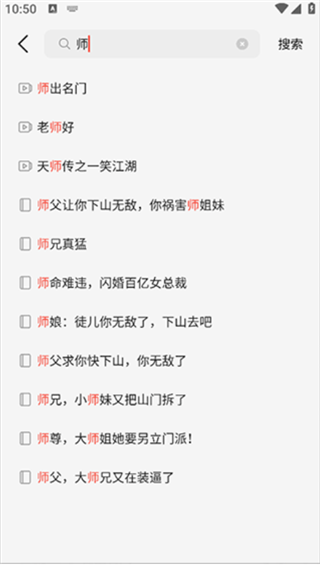 2、在顶部搜索栏内输入关键字,比如“师”,就会匹配很多相关作品。