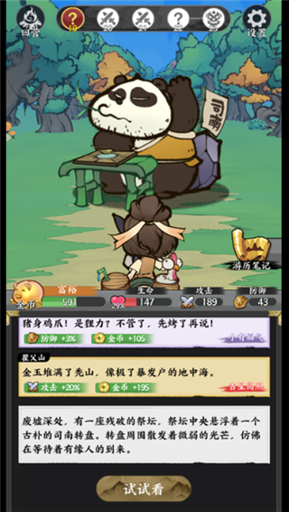 字走山海手游是一款创意十足的文字冒险类手游,你原本是生活在现实生活中的上班族,因为一场意外穿越到了山海世界当中,开启了一段全新的旅程,从此刻开始你需要选择自己的命运,通过文字推动剧情。刚刚出发的你就遇到了一个拿着福袋的小孩出现,直接给了你一大把盘缠,这天将好事也太爽了吧,白赚这么多,不过每次开启关卡前都需要支付一定的盘缠。关卡中还有这很多随机事件,比如咱们正在泡温泉的时候,突然遇到了一个怪人蹲在草丛中,没想到竟然是传说中的神农,这也太幸运了,直接得到了一把草药。