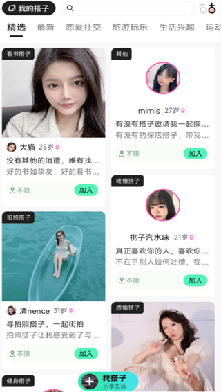 对于很多在外地打拼的上班族来说,可能每天的生活都是两点一线,公司和出租屋,也没有什么社交的机会,但是看着自己年龄越来越大,也多少会有点着急了。那么不妨看看搭子星球app官方版,这是一款非常安全可靠的社交平台,能够帮助大家寻找很多有趣的伙伴,不管是打游戏开黑,还是来一趟说走就走的旅行,都可能找到志趣相同的搭子。当你找到了TA以后,会觉得生活都变得有意思了许多,打游戏不用在孤零零的单排,在工作上遇到烦心的事情也有人可以唠唠。平台里还有不少的兴趣小组,大家可以寻找自己感兴趣的话题加入其中,每天都能收获满满的乐趣。