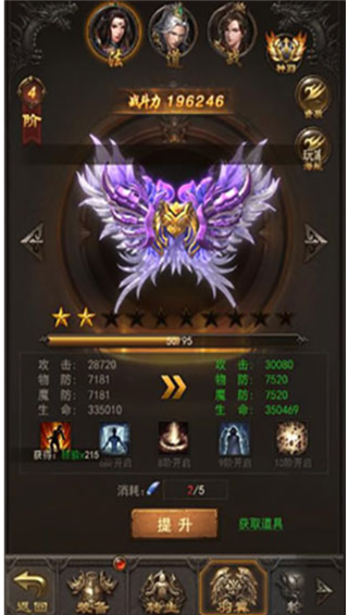 除了元神,羽翼也能够提升人物的属性,而且还附带强力技能哦!羽翼能让你的角色攻防兼备,效果全面,但高阶羽翼消耗材料巨大,在这里,建议普通玩家不要强行提升,可通过每日副本慢慢积攒,神秘商店如果能刷新到打折的羽毛也可酌情购买。