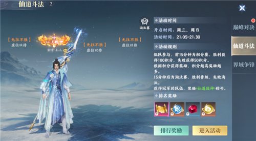 组队参与,前15分钟为积分赛,胜利获得100积分,失败获得50积分。根据积分获得奖励,积分越高奖励越多。15分钟后为淘汰赛,胜利晋级,失败淘汰。获得冠军的队伍,奖励 <仙道战神> 称号。