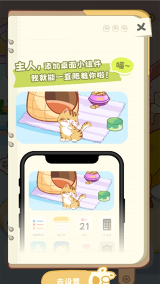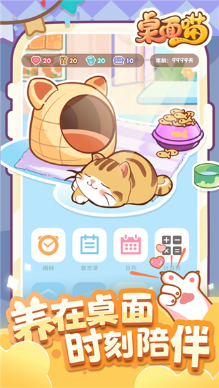 桌面喵官方版是一款十分可爱的宠物养成应用,对于很多朋友们来说,宠物往往是大家生活中最好的陪伴之一,但是如果现实生活中养一只宠物的话还是需要一定的开销和时间,所以不妨在虚拟世界中饲养一只能够时刻陪伴在你身旁的萌宠也是不错的选择。大家打开应用后,可以选择不同种类的猫咪,像中华田园猫、布偶猫、安哥拉,奶油猫等应有尽有,这些可爱的小动物们非常会撒娇,总是希望你能够陪伴它们一起玩耍,大家需要在手机上跟它们互动、喂食以及铲屎等日常,看着自己的小猫咪不断长大也是非常的有成就感。
