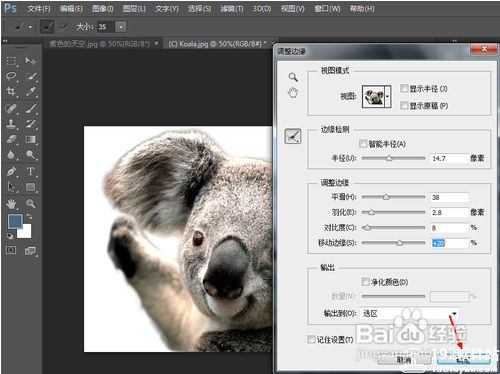 5、在调整边缘窗口中,可以自行设置边缘平滑度、羽化值、对比度等多个数值,并能够实时查看调整的结果,当调整的结果符合要求时,单击下方的“确定”即可。