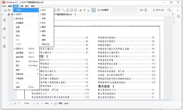 4、点击“查看”选项,可访问工具栏、状态栏、标注显示、划线翻译、目录、页面视图、实际大小、放大、页面布局等功能。